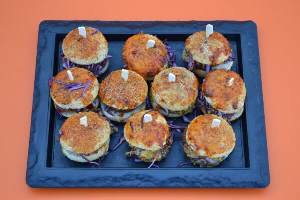 Belegd met kipburgertje, baconsaus , kool, sla en pittig sausje!