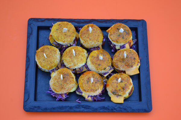 Zacht broodje met burgertje sla saus en kaas. 10 stuks