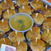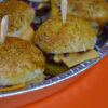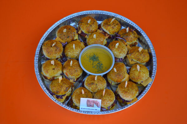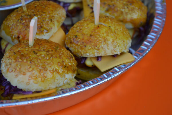 Belegde mini cheeseburgers geleverd in een ovenschaal.
