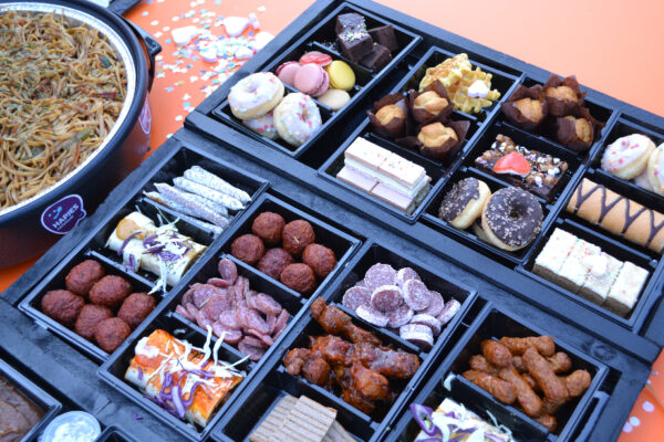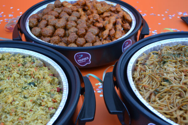 Het warme gedeelte word geleverd in elektrische pannen, deze zet u aan 30 min voor aanvang buffet.