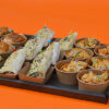 Deze schaal is volledig serveer-klaar. Wij leveren de gerechten op een luxe plateau, zodat u direct kunt genieten van een zorgeloze en kwalitatieve maaltijd op uw eigen locatie.