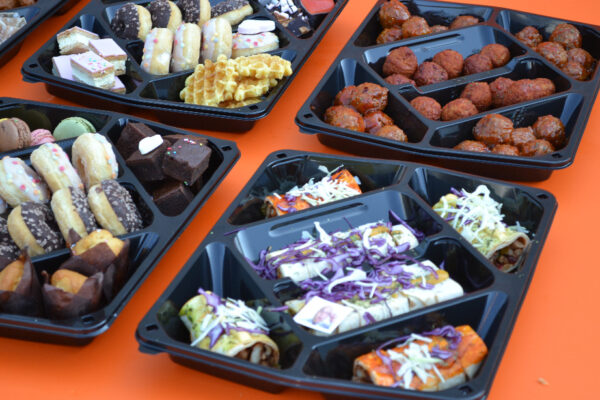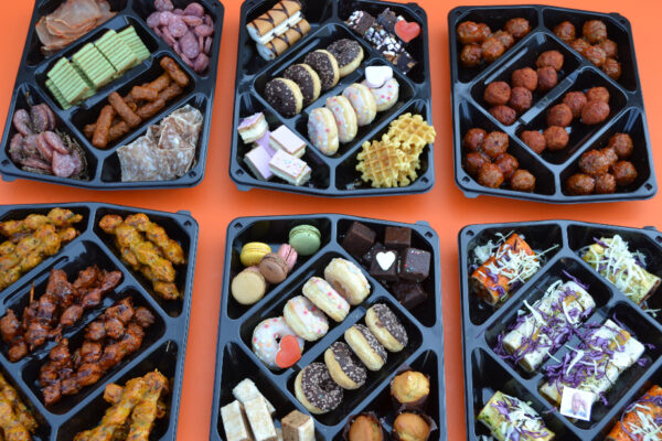 Wilt u een compleet assortiment op tafel zonder uren in de keuken te staan? Deze indrukwekkende mix van 6 schalen biedt een volledige catering-ervaring. Van hartige saté en wraps tot een uitgebreid dessertbuffet: voor iedere gast zit er iets lekkers tussen.