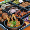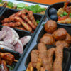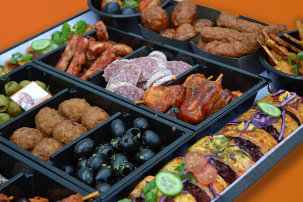Deze schaal is gevuld met 4 verschillende soorten sate, gehaktballetjes, wraps, chorizo, olijfjes etc….