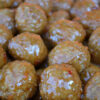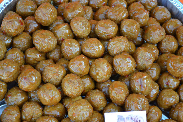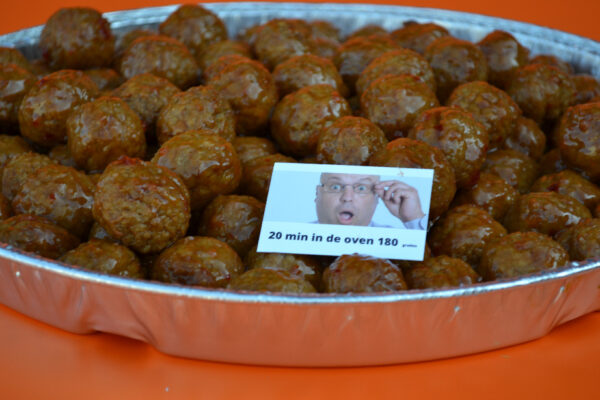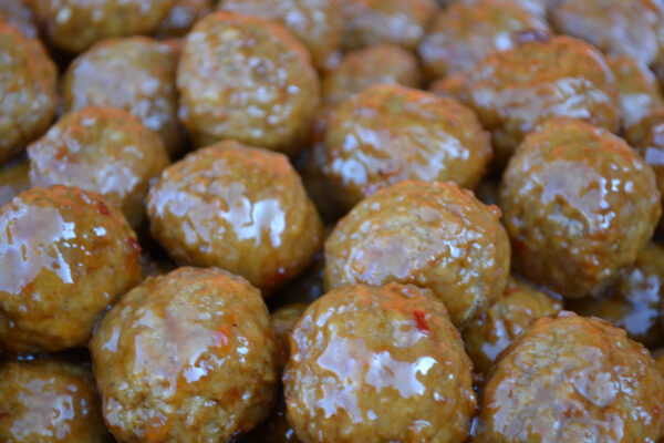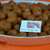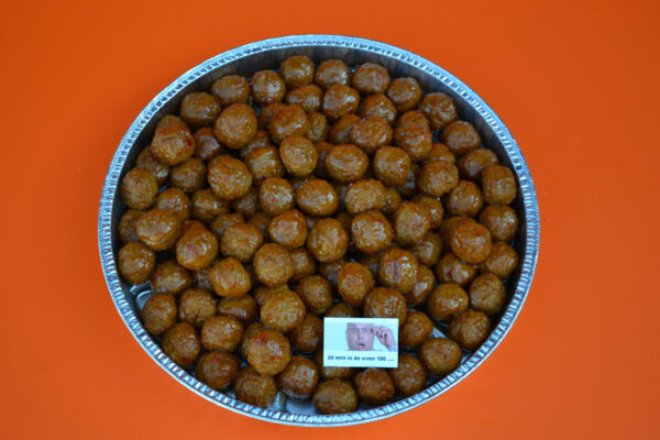 Ovenschaal gevuld met ongeveer 100 kip gehaktballetjes.